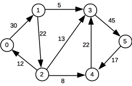 | 0 1 2 3 4 5 | --| -- -- -- -- -- -- | 0 | - 25 - - - - | 1 | 5 - 22 - - - | 2 | 12 - - 13 8 - | 3 | - 5 - - - 40 | 4 | - - - 22 - - | 5 | - - - 5 17 - | --| -- -- -- -- -- -- |Grading: 0.7 per correct edge/weight combo. 0.3 per correct edge/weight combo if you chose the path as 0-1-2-3-5 with a flow of 13, and 0.2 per correct edge/weight combo if you chose the path as 0-1-2-4-3-5 with a flow of 8.