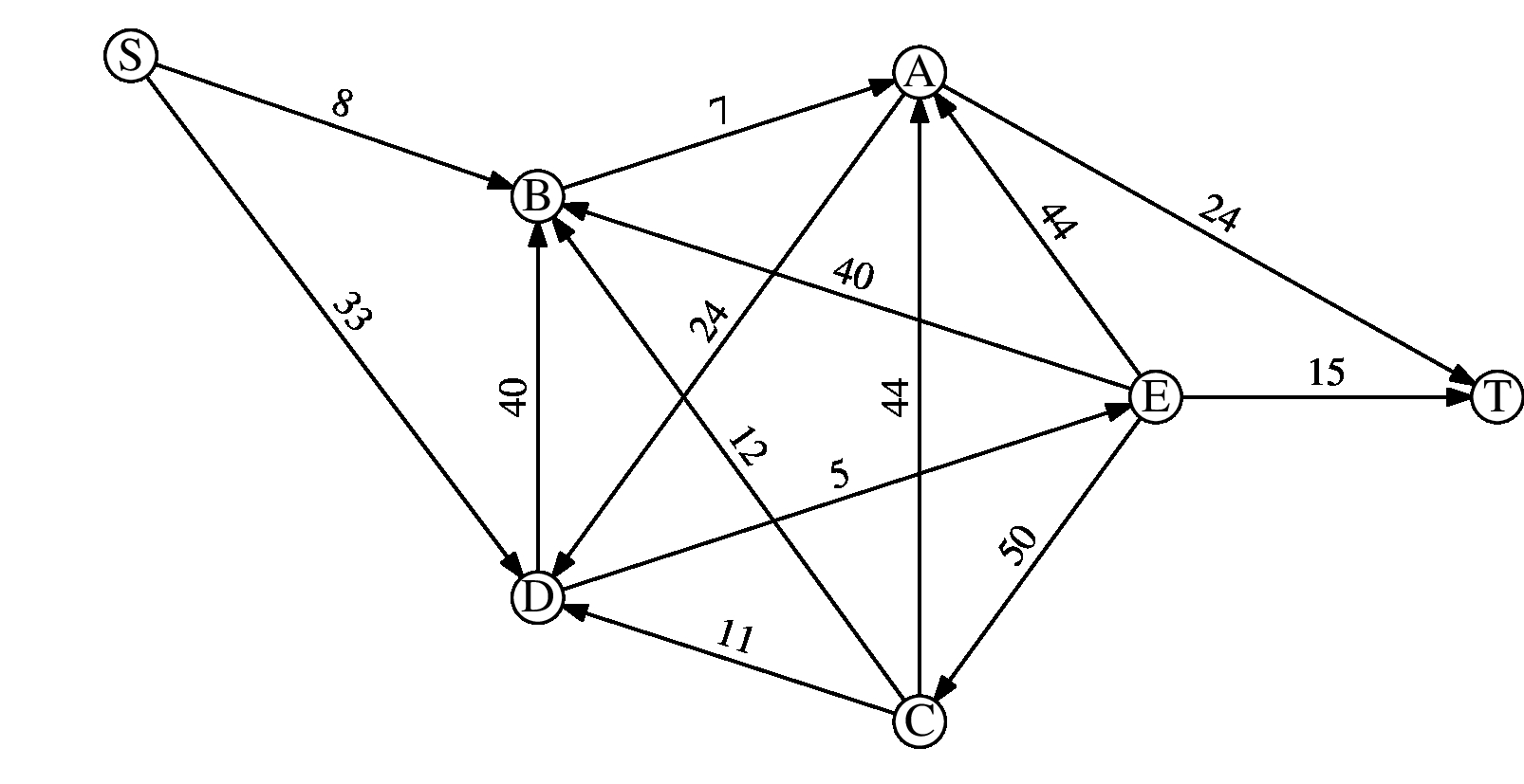 Answer: First do a DFS from S to identify the nodes that are reachable from S. Those are nodes S, B and D. The minimum cut is composed of the edges from those nodes to the others in the original graph: BA and CE. The maximum flow is equal to the sum of the weights of those two edges: 7+5 = 12.