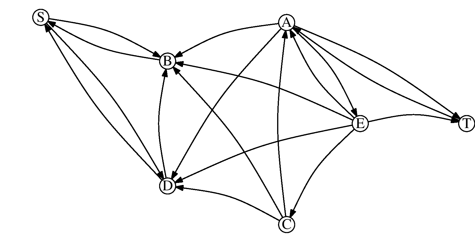 In the box below, enter the maximum flow on the first line (just a number). And then enter the minimum cut on the next lines, one edge per line. No spaces; no punctuation. Use, for example, SA to represent the edge from S to A.