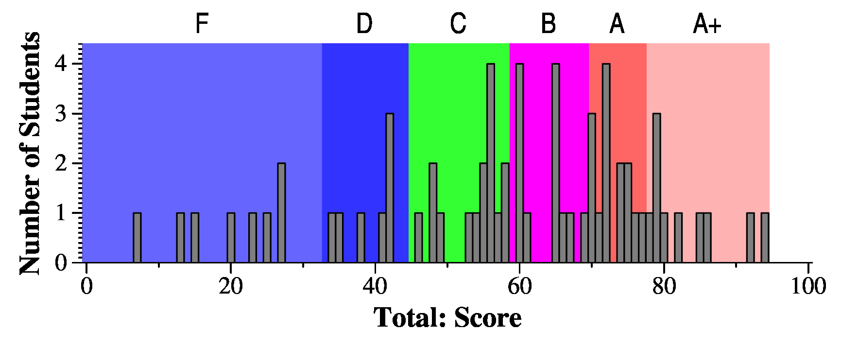 Here is the mapping of scores to letter grades. I don't put plusses and minuses on