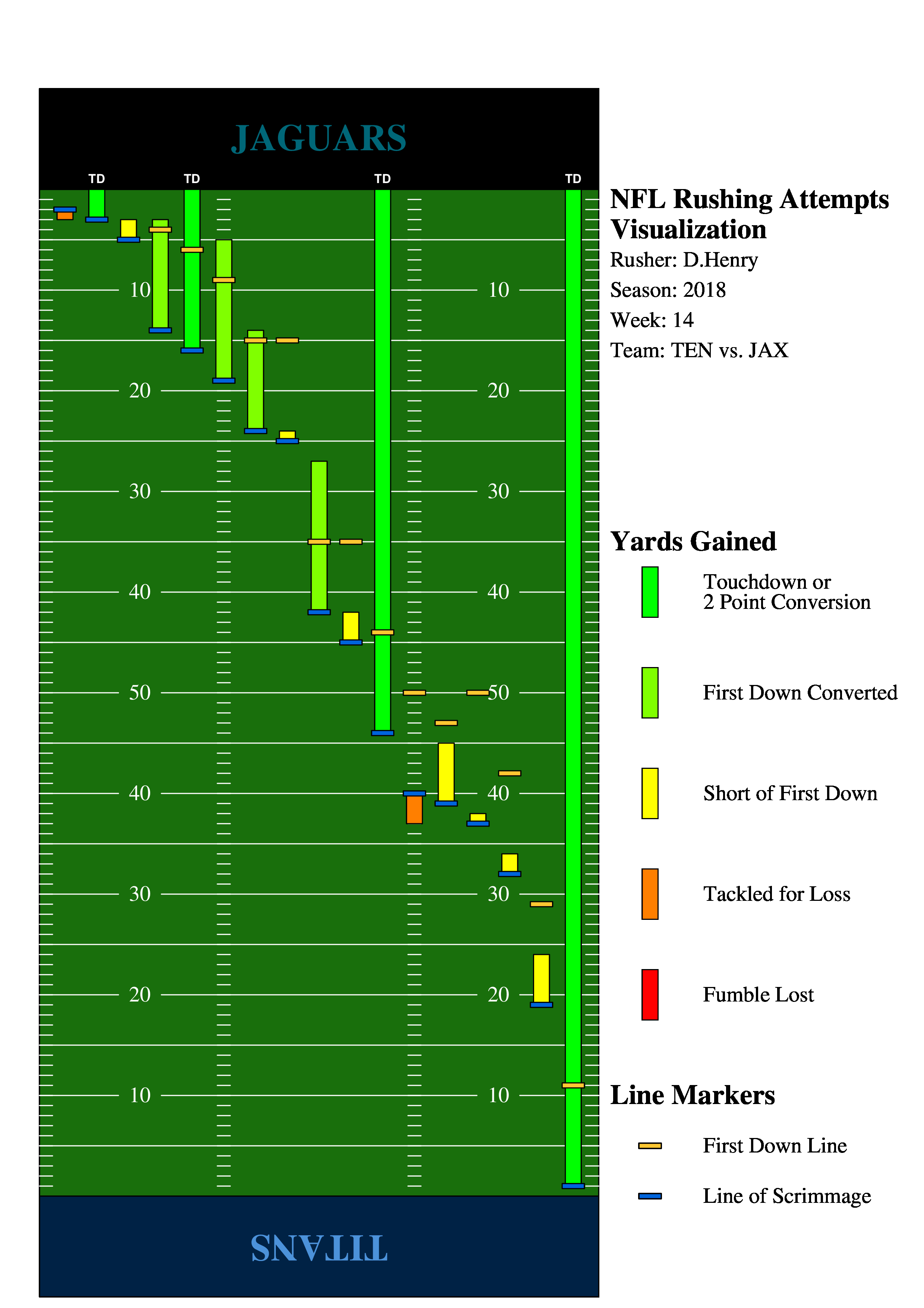 Each play is represented by a vertical bar, which begins at the line of scrimmage for that play and ends where the rusher is downed, fumbles the ball, or enters the endzone for a score. Each play is color coded for the "success" of the play.