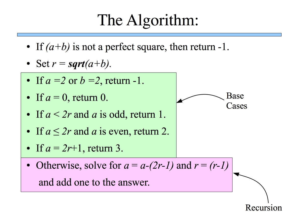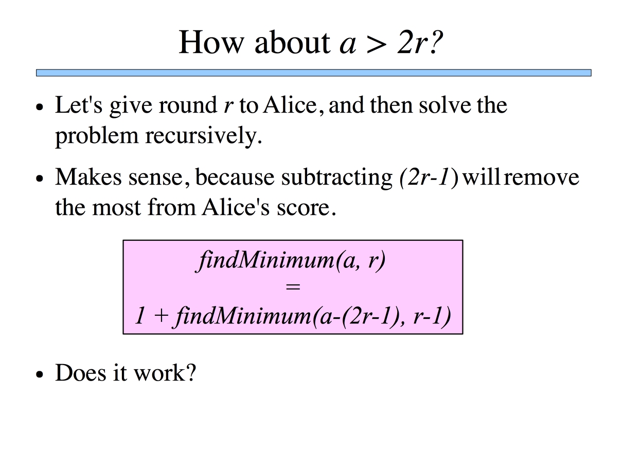 Similarly, in Slide 10, I present the recursion as an equation. I don't say the equation in my talk, but instead say what it means: "To solve the general problem with a and r, you solve the subproblem of a minus 2r-1, and r-1."