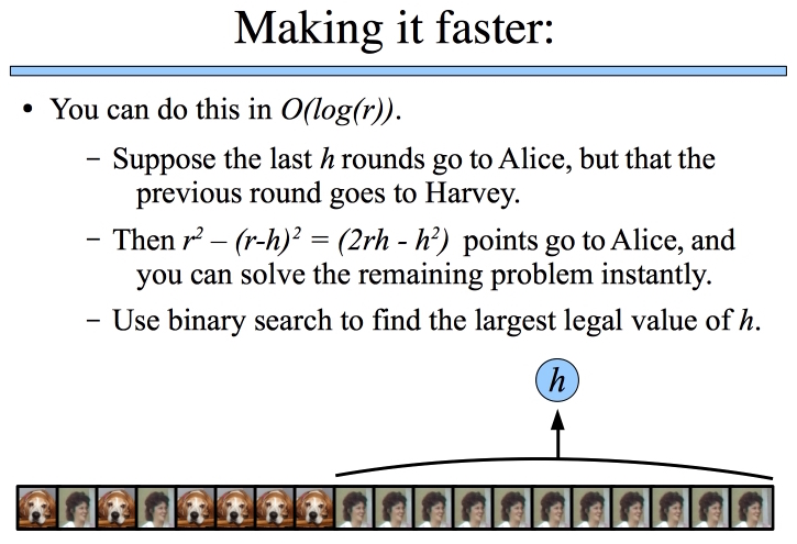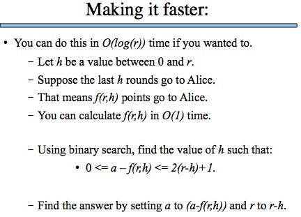I think that this is a much harder talk than the ChristmasTreeDecoration problem. The reason is because the ChristmasTreeDecoration problem fits very nicely into graph algorithms that we teach in CS302 (DFS, Disjoint Sets, Minimum Spanning Tree). The AliceGame problem is one where you have to figure out the insight to solve it using recursion, as I did, or simply using math.