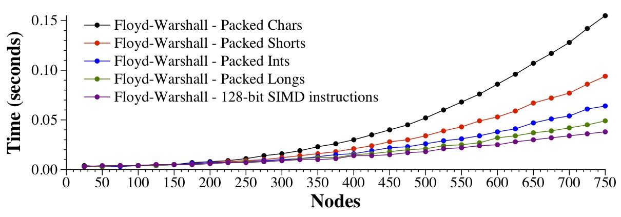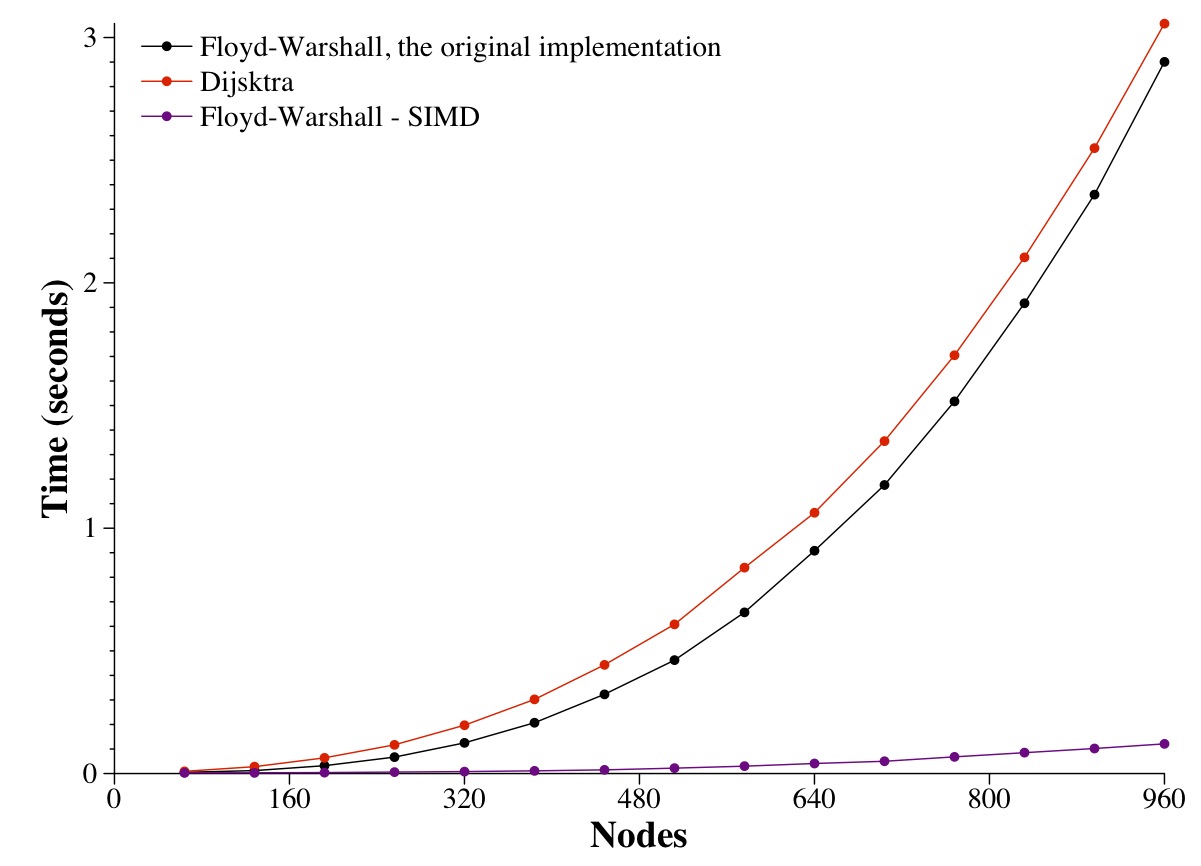 This last graph shows the original Floyd-Warshall implementation, the fastest DFS implementation, and the 128-bit SIMD implementation -- that's an amazing difference, is it not?