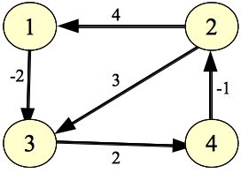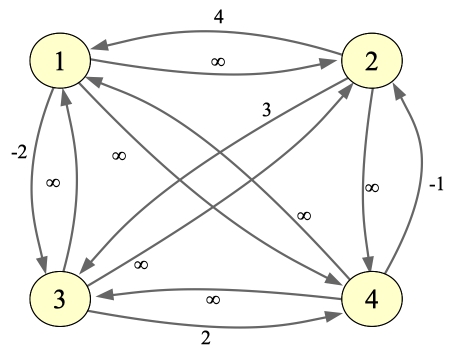 You'll note first that it has negative edges. That's ok, as long as there are no negative cycles in the graph (which there aren't). Now, we're going to work through the algorithm, and what I'll do is at each step, show you SP both in graphical form and as a matrix. I'm going to sentinelize the lack of an edge with ∞.