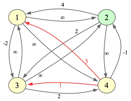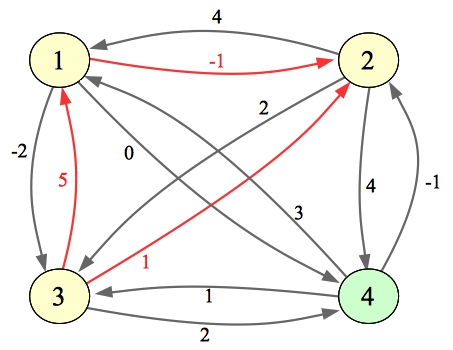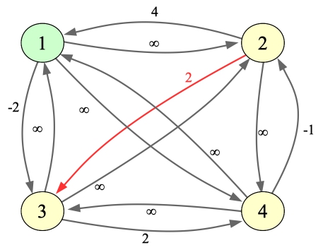 As you can see, there is one place where SP is improved. I'll update the drawing and the matrix below. I've colored the changed edges/values in red, and I colored node 1 in green to show that it was the intermediate node in these paths: