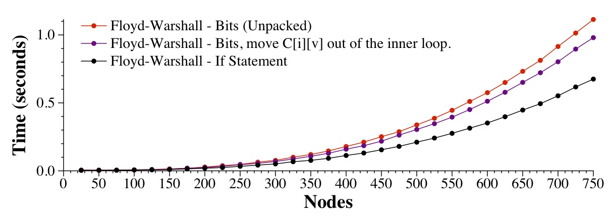UNIX> for i in 0 1 2 3 4 5 6 ; do # I'm using bash here > tip-fw-if $i | tail -n 1 > tip-fw-bits $i | tail -n 1 > tip-fw-bits-2 $i | tail -n 1 > done 0.5000000000 0.5000000000 0.5000000000 1.5000000000 1.5000000000 1.5000000000 3.0000000000 3.0000000000 3.0000000000 0.0000000000 0.0000000000 0.0000000000 9.9998915581 9.9998915581 9.9998915581 1.7525000000 1.7525000000 1.7525000000 1.2500000000 1.2500000000 1.2500000000 UNIX>I've timed these on my MacBook (2.4 Ghz Core i5), and the results make sense. Because these matrices are dense, C[i][j] is true a lot of the time, and that makes the if statement exit early a lot. On the flip side, C[i][v] is also true a lot, so moving it out of the inner loop doesn't eliminate the inner loop very much.