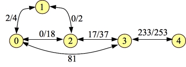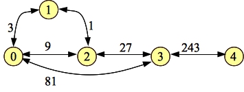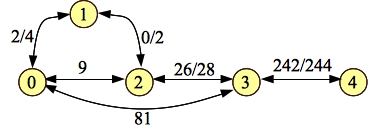 It should be pretty clear that the total flow through this graph is 1+9+81 = 91. Let's process paths through this graph. Start with 0-1-2-3-4, with a flow of one. Here's the residual (I'm showing the forward-edge-weight/backward-edge-weight):