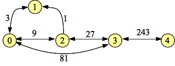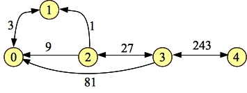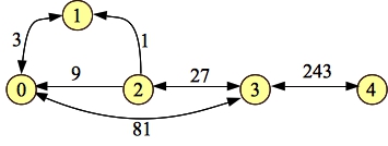 We really should do a formal proof of this, but I'm not going to -- I'll leave that to the motivated student. When we program it, what we'll do is represent each edge's weight by its logarithm base three (which is just its index in the input vector). That will be a number between 0 and 1999. No more worries about long long's!