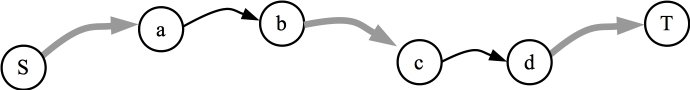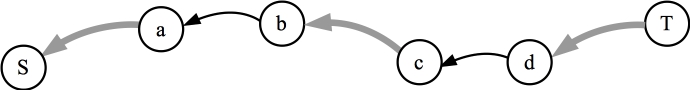 We can create the residual graph from the flow graph. In particular, the residual graph equals the original graph with the following modifications. If edge (e,f) is in the flow graph with a flow of x, then x is subtracted from (e,f) in the residual graph, and added to (f,e). Our assumption is that there is a flow graph with a path from S to T through both (a,b) and (c,d). We draw that as follows: