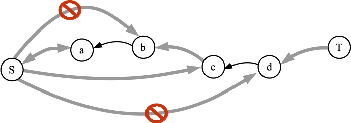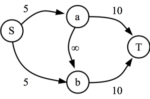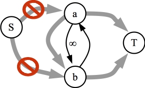 ![]() The residual graph. There is a contradiction here, because there is a path to b, but there cannot be a path to b. |