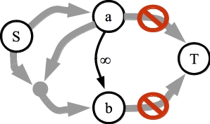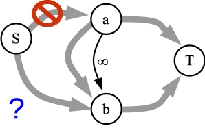 ![]() The residual graph. Since a is not on the source side of the cut, there is no path from S to a. The question is, that if we can construct a maximum flow graph that uses the infinite capacity edge, can there be a path from S to b? |