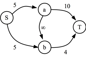 On the flip side, in the graph below, it is impossible to construct a maximum flow graph that uses the edge (a,b). In order to push 9 units of flow through, all of the flow through a has to go directly to T. As you'll note, b is on the source side of the cut.