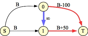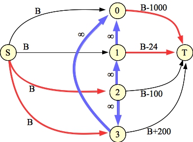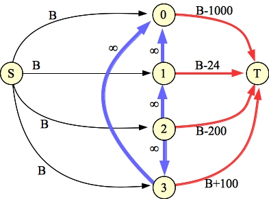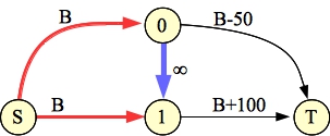 Now, determine the minimum cut of the graph. It will have to involve only edges from A or to B. The nodes corresponding to those edges are not in our optimal set. The remaining nodes are.