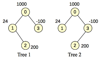 You can eyeball that one to see that the subtree is composed of nodes 0 and 1. That is a connected component in both trees and its total weight is 1024. You'd like to be able to add node 2 to the mix, but if you do so, you'll have to include node 3, to make the component connected in tree 2. Because node 3's weight is -100, and node 2's weight is only 100, it is not profitable to add both nodes to our final set.