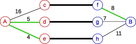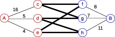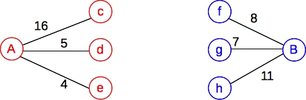 Does this work? Let's try a simple example. Suppose A = { c, d, e } and B = { f, g, h }, and weights are assigned as follows: