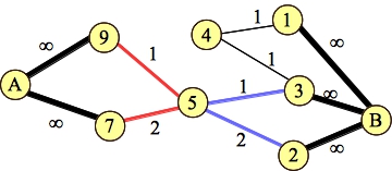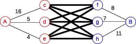 Let's try a harder example. We'll use the same sets and weights as above, but now let's constrain it so that if you include any node from A, then you can't include any node from B. Again, we don't need network flow to solve this -- simply sum up the weights from A and the weights from B, and whichever is larger, you use all of them. But we can model it with a graph defined as above, where all of those thick edges have infinite capacity: