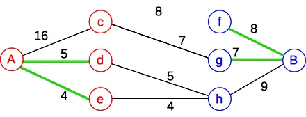 It should be clear that the max flow through this graph has three paths of flow 8, 5 and 4. Therefore, the min cut is composed of the green edges: (A,d),(A,e),(f,B), meaning those three nodes (d,e,f) are not in our collection. The other three (c,g,h) are. Nice.