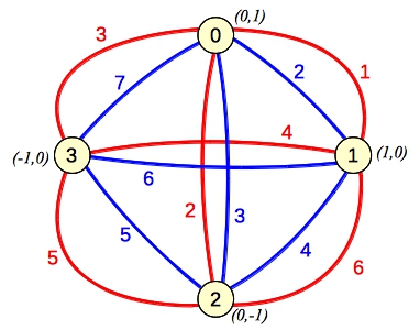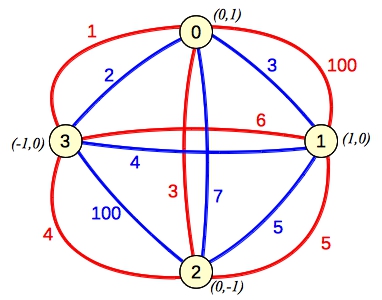 Let's illustrate this with Example zero, which has four points: (0,1), (1,0), (0,-1) and (-1,0). I'll draw them on a graph and label their scores as colored edges: