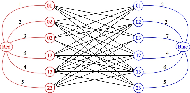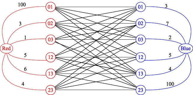 Now, let's formulate the problem in terms of the partitioning problem above. Given a set with N points, there are going to be exactly (N)(N-1)/2 red edges and (N)(N-1)/2 blue edges. These edges are going to be the elements that we partition in our general problem. You'll note, each edge has a weight. And we are selecting edges from each partition subject to the constraint that no edges from different partitions intersect. And we want to maximize the total weight of the selected edges.