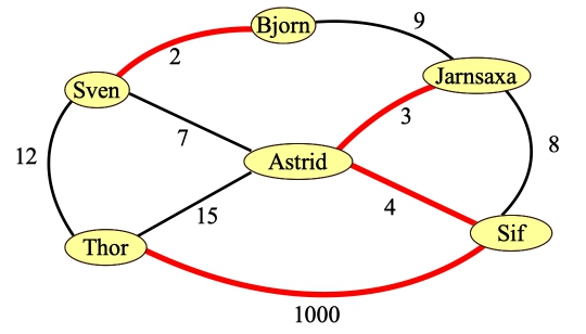 With Thor as a source and Sif as a sink, it's pretty easy to see that the maximum flow is 1009, and that the minimum cut is composed of the red edges. Sven and Astrid stay with Thor. Bjorn goes with Sif, and in a fit of irony, Jarnsaxa goes with Sif as well...