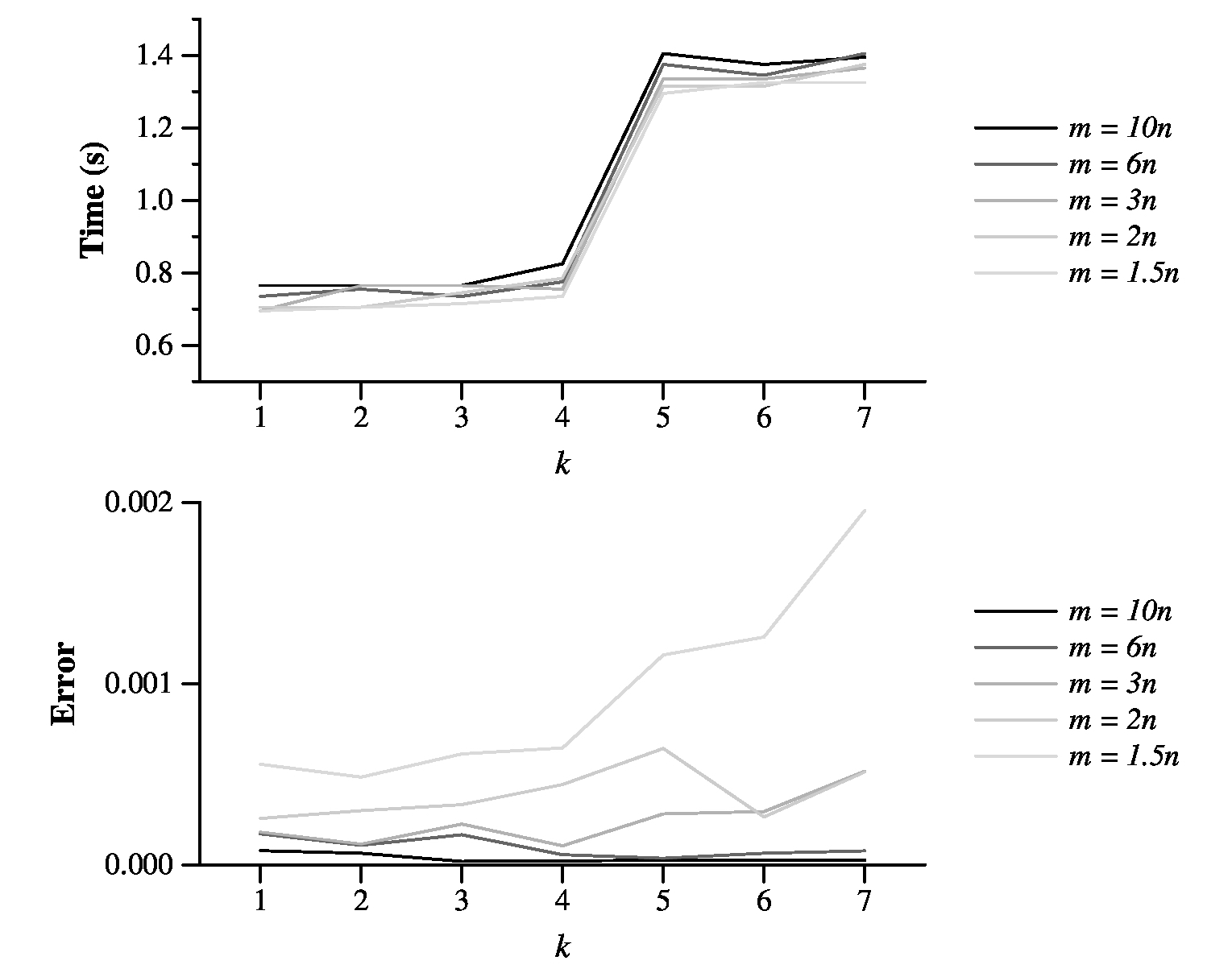 So, maybe we can get away with smaller values of m and k. Below is a graph where I plot time and error for various settings of m and k: