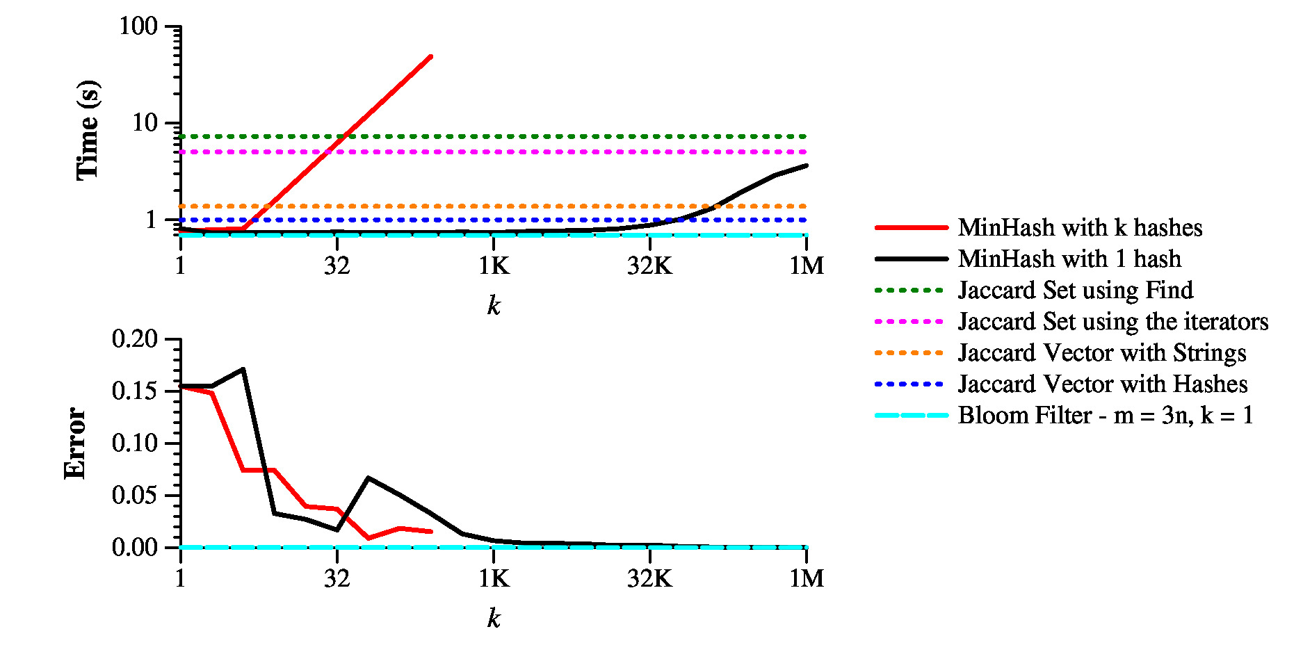 As you can see, you can make the direct calculation of Jaccard similarity pretty fast; however, the 1-hash version of MinHash is significantly faster up to k=10K or so, which gets you under 1% error. The k-hash version of MinHash is completely useless.
