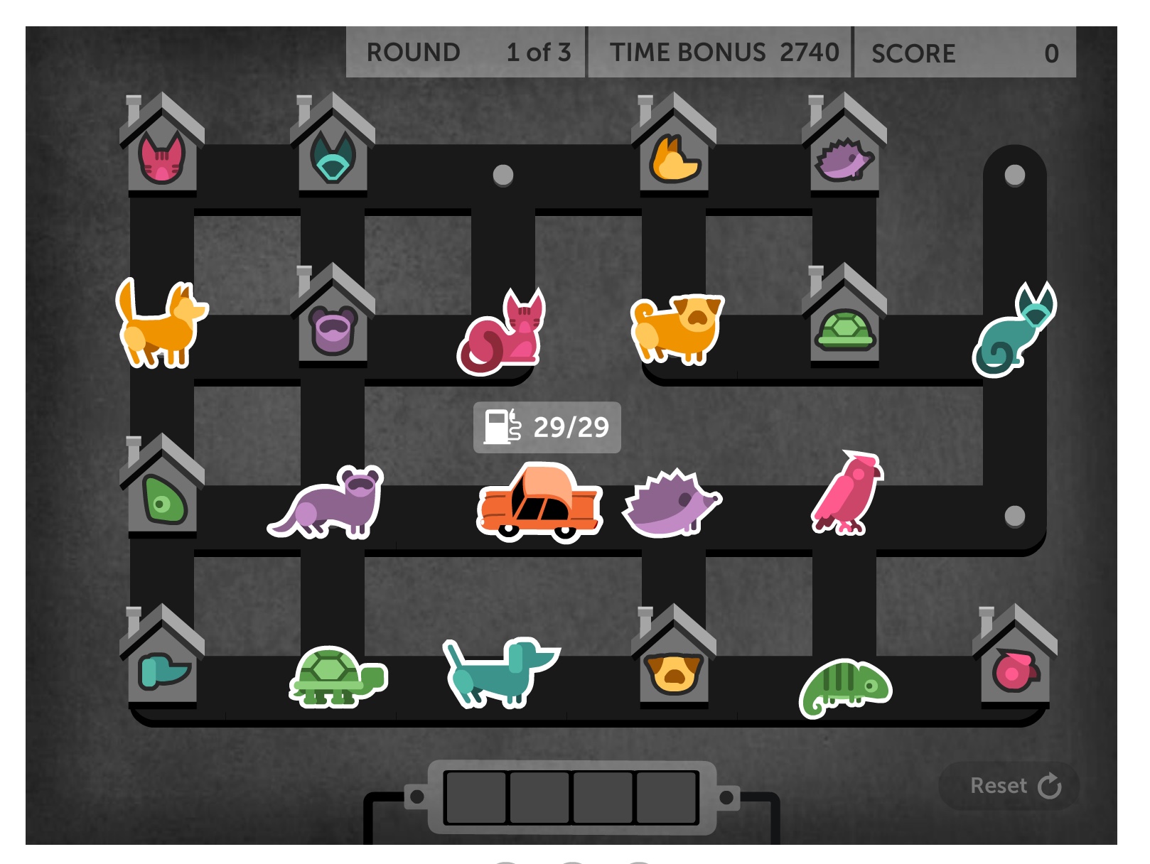 Pet Detective is a game published by Lumosity that asks you to deliver pets to their homes within a specified number of moves. A screen shot of Pet Detective is shown below and you can view a video of a person playing the game here. Please note that you can skip over a pet without picking it up or skip over a home without visiting it.