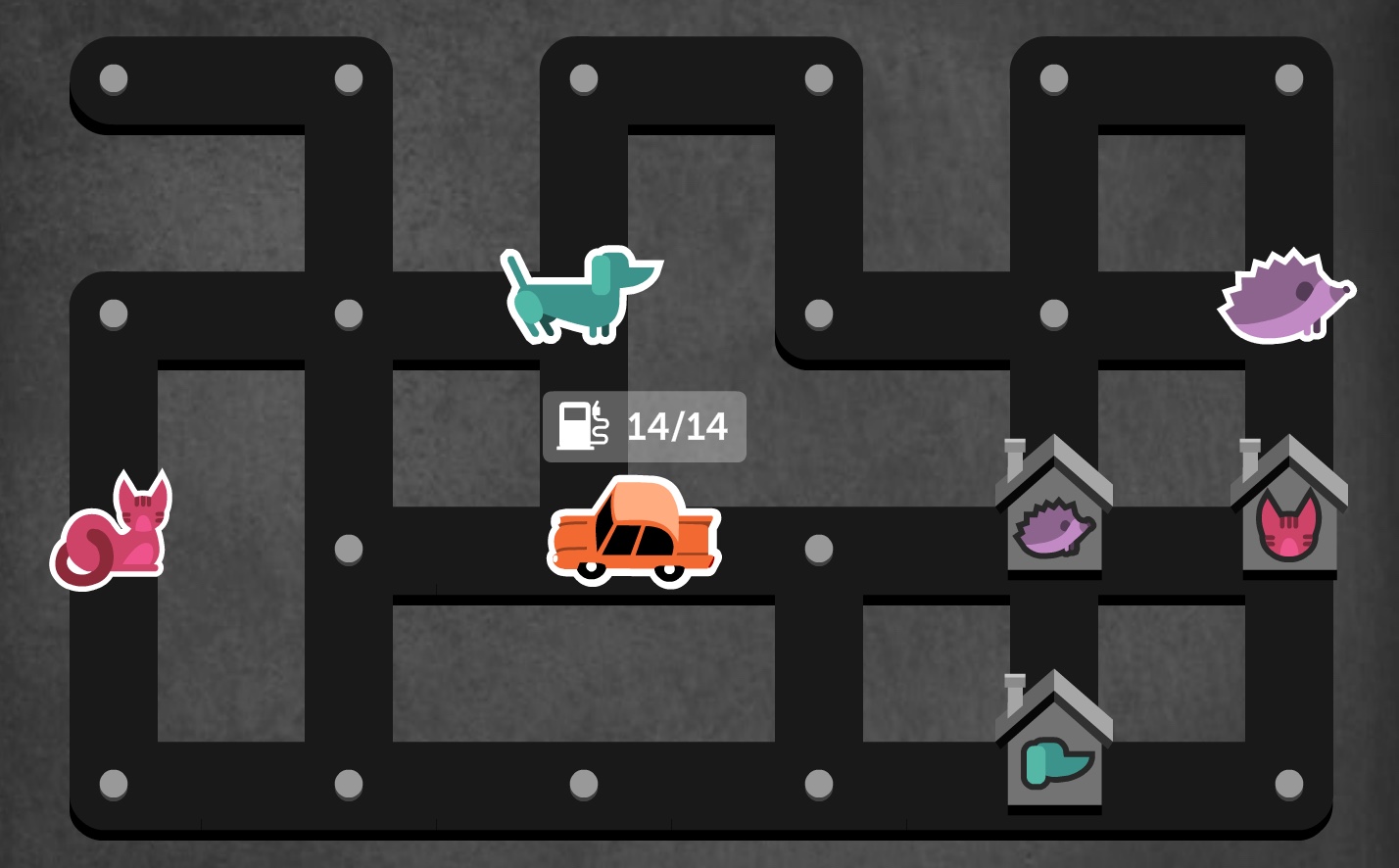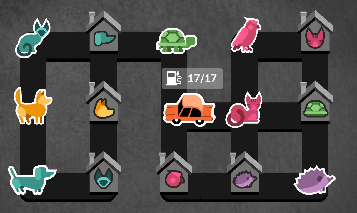 As you can see from the video, at each turn you move the car to either a pet, thus picking it up, or to a pet home, thus dropping it off. As you can also observe, the car has a capacity of 4 pets. Hence once you've loaded 4 pets into the car, you must deliver a pet to its home at the next turn before you can pick up another pet.