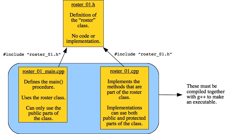 UNIX> g++ -o roster_01 roster_01.o roster_01_main.o UNIX>The reason why separate compilation is nice is that compiling from object files is faster than from the source files (the .cpp) ones. Thus, when we compile incrementally, and we change a source file, we recompile the changes source to its object file and then relink all the object files. That is faster than calling g++ on all the source files.