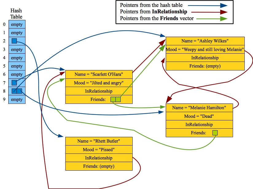 UNIX> djbhash Scarlett O'Hara 1585424537 Rhett Butler 3831887322 Ashley Wilkes 2242265818 Melanie Hamilton 1839425308 <CNTL-D> UNIX>That means that "Scarlett O'Hara" goes into hash table entry 7, "Rhett Butler" goes into hash table entry 2, and both "Ashley Wilkes" and "Melanie Hamilton" go into hash table entry 8. Armed with that knowledge, take a look at the hash table, the four Person class instances, and all of their pointers. There are three places where pointers are used: