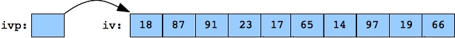 I'll illustrate again. First, we set iv to be a vector of 10 random integers. Then we set ivp to point to iv and we print it out. I use the at() method instead of square brackets just because it looks better. Instead of ivp->at(i), I could have done (*ip)[i], but I don't like how that looks.