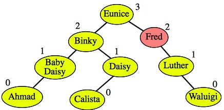 Here's another example, where we inserted Waluigi and that made the tree imbalanced at Fred:
