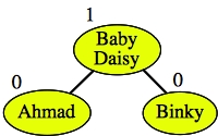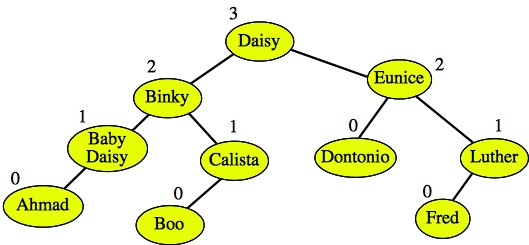You check Calista's old parent -- Binky and although Binky's height hasn't changed, the node is imbalanced. It's clearly a Zig-Zig tree, so you rotate about Baby Daisy to yield the following tree: