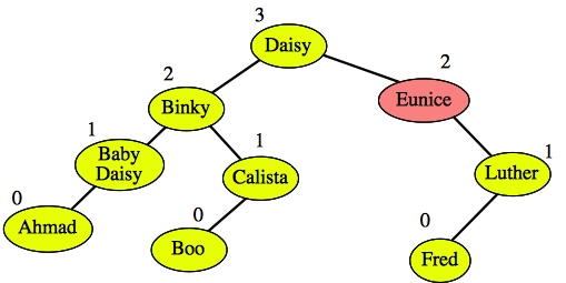 The new node Ahmad has a height of zero, and when I travel the path up to the root, I change Baby Daisy's height to one. However, her node is not imbalanced, since the height of her subtrees are 0 and -1. Moving on, Binky's height is unchanged, so we can stop -- the resulting tree is indeed an AVL tree.