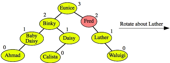 Traveling from the new node to the root, I see that Fred violates the balance condition. Its left child has a height of -1 and its right child has a height of 1. I have to rebalance the tree.