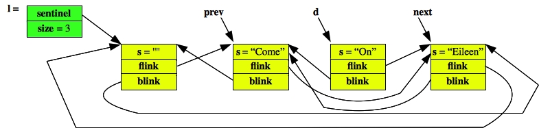 As before, in Erase(), we'll have two (Dnode *)'s, this time called prev and next. We set them to the two nodes surrounding d: