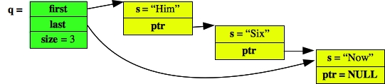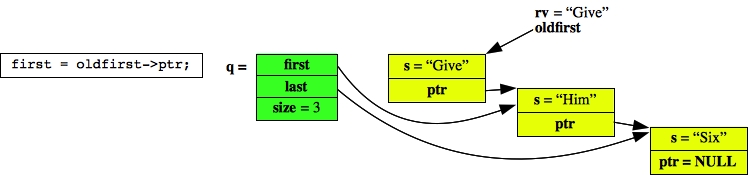 Let's first consider calling Pop(). The code is nearly exactly like the stack code, only we are removing the first node rather than the top node, and we have to put some extra code in to handle popping the last node on a queue. The code is in queue.cpp: