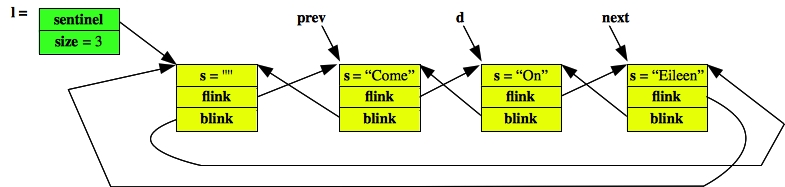 As before, in Erase(), we'll have two (Dnode *)'s, this time called prev and next. We set them to the two nodes surrounding d: