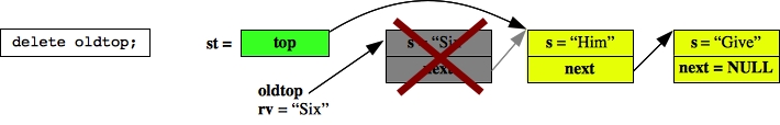 Pop() on the other hand, needs to store the string that is on the first node, remove that node from the stack, and return the stored string. Since Push() called new, Pop() must call delete. Otherwise, our stack implementation will have a memory leak.
