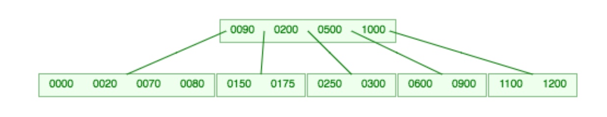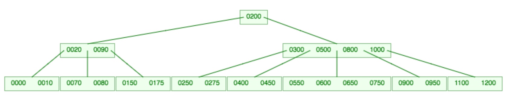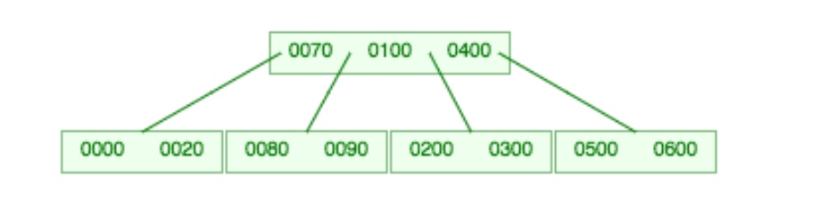 Solution: When we delete 80 from its leaf node, the leaf node no longer has the minimum number of keys. It first looks to see if it can take a key from either its left or right sibling, but both siblings have the minimum number of keys as well. Hence the leaf node must merge with its left sibling, which is the leaf node containing the keys 0 and 20. When this merger occurs, 70 gets demoted from the parent and included in the new leaf node because 70 used to point to the two separate leaf nodes and now they have been merged. Thus 70 must get bundled into the new leaf node as well. The resulting BTree is shown below: