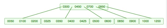 Solution: When 375 gets inserted into the tree, it gets inserted into the leaf node containing the keys 325, 350, 400, and 425. Since the B-tree is of order 5, nodes can only hold 4 keys. Hence we must split the leaf node and promote the middle element, which is 375, to the parent node. When we promote 375 to the parent node, it also overflows and must be split in two. We promote the middle element, which is 450, and it becomes the new root of the tree. The new tree is shown below: