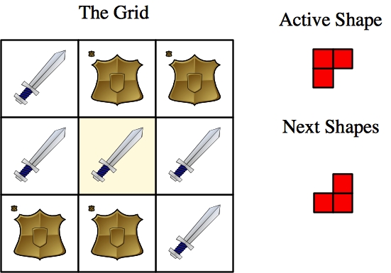 Those are the mechanics of the game. You are given a grid of swords and shields and a collection of shapes. Your goal is to apply all of the shapes to the grid so that you end up with a grid of all swords.