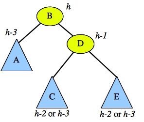 And you insert a node into tree F, which changes F's height from h-3 to h-2. Let's assume that F is still an AVL tree, so we have this tree, where A C and F are all AVL trees: | ![]() |