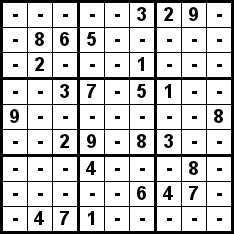 UNIX> make sudoku g++ -c -o sudoku_main.o sudoku_main.cpp g++ -c -o sudoku.o sudoku.cpp g++ -o sudoku sudoku_main.o sudoku.o UNIX> sudoku no convert < example3.txt | head convert -size 234x234 xc:Black \ -background White -fill Black \ \( -size 24x24 -gravity Center label:- \) -geometry 24x24+3+3 -gravity NorthWest -composite \ \( -size 24x24 -gravity Center label:- \) -geometry 24x24+3+28 -gravity NorthWest -composite \ \( -size 24x24 -gravity Center label:- \) -geometry 24x24+3+53 -gravity NorthWest -composite \ \( -size 24x24 -gravity Center label:- \) -geometry 24x24+3+80 -gravity NorthWest -composite \ \( -size 24x24 -gravity Center label:9 \) -geometry 24x24+3+105 -gravity NorthWest -composite \ \( -size 24x24 -gravity Center label:- \) -geometry 24x24+3+130 -gravity NorthWest -composite \ \( -size 24x24 -gravity Center label:- \) -geometry 24x24+3+157 -gravity NorthWest -composite \ \( -size 24x24 -gravity Center label:- \) -geometry 24x24+3+182 -gravity NorthWest -composite \ UNIX> sudoku no convert < example3.txt | sh UNIX> mv Sudoku.jpg example3-problem.jpg UNIX> sudoku yes convert < example3.txt | sh UNIX> mv Sudoku.jpg example3-solution.jpg UNIX>I won't explain convert. However, the mechanics of Print_Convert() are not that bad. I create a big black square, and then I plot white squares with the contents of each cell printed as labels. I use the following variables: