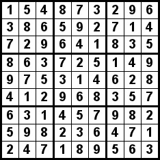 UNIX> sudoku5 yes screen < example1.txt 9 6 3 1 7 4 2 5 8 1 7 8 3 2 5 6 4 9 2 5 4 6 8 9 7 3 1 8 2 1 4 3 7 5 9 6 4 9 6 8 5 2 3 1 7 7 3 5 9 6 1 8 2 4 5 8 9 7 1 3 4 6 2 3 1 7 2 4 6 9 8 5 6 4 2 5 9 8 1 7 3 UNIX> sudoku5 yes screen < example2.txt 4 3 6 7 2 8 5 1 9 9 2 5 3 1 4 6 7 8 1 7 8 5 9 6 2 3 4 8 6 9 1 5 7 3 4 2 3 5 2 6 4 9 1 8 7 7 4 1 2 8 3 9 5 6 6 1 4 8 3 2 7 9 5 5 8 7 9 6 1 4 2 3 2 9 3 4 7 5 8 6 1 UNIX> sudoku5 yes screen < example3.txt 1 3 7 8 9 4 6 5 2 5 8 2 6 7 1 3 9 4 4 6 9 3 5 2 1 8 7 8 5 6 7 3 9 4 2 1 7 9 4 2 1 6 5 3 8 3 2 1 5 4 8 7 6 9 2 7 8 1 6 3 9 4 5 9 1 3 4 2 5 8 7 6 6 4 5 9 8 7 2 1 3 UNIX>It's pretty quick too. It may be disappointing to you that a program so simple can solve Sudoku problems so quickly. If you really wanted it to be fast, or if you wanted to solve larger puzzles, you would probably have to put some more smarts into the program. However, for puzzles of this size, the simple recursive solution works very well.