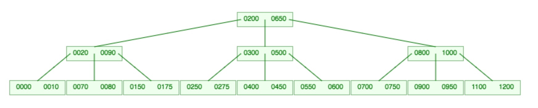 When 650 gets promoted to the parent node, the parent node overflows because it can only hold 4 keys. Again 650 is the middle key (300, 500 650, 800, and 1000 are the keys) so we promote 650 to the root node and split the parent node. 300 and 500 move into one node and 800 and 1000 move into the other node. The resulting tree is shown below: