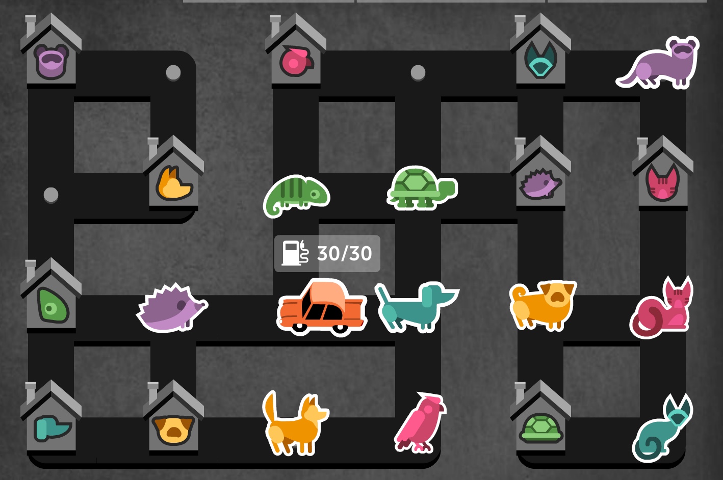 As you can see from the video, at each turn you move the car to either a pet, thus picking it up, or to a pet home, thus dropping it off. As you can also observe, the car has a capacity of 4 pets. Hence once you've loaded 4 pets into the car, you must deliver a pet to its home at the next turn before you can pick up another pet.