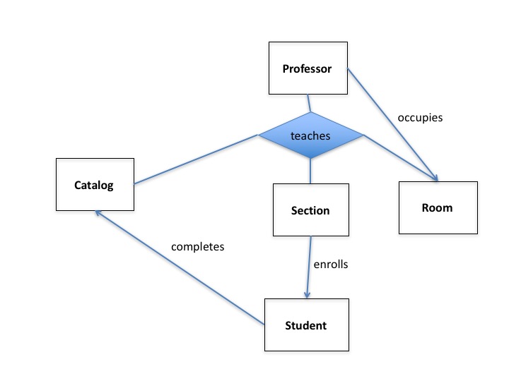 Best Solution: Section is a teaching relationship among a professor, a course, and a room and a Roster is a relationship between a section and a student. So technically, the relationship is: A professor teaches students in a course in some room. Transcript is also a many-many relationship between courses and students.