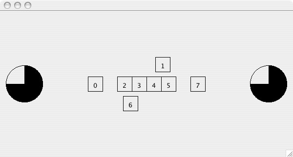The two clocks start after a four second delay and update themselves every second. The clock on the left is controlled by a Util timer and the clock on the right is controlled by a Swing timer. The Util timer updates at a fixed execution rate of once per second, meaning that even if an execution is delayed for some reason, the next execution will occur at the next second (e.g., the actual execution might be 1.25, 2, 3, 4.5, 5, 6.05, 7, ...) while the Swing timer can drift (e.g., the actual execution might be 1.25, 2.25, 3.25, 4.75, 5.75, 6.8, 7.8, ...). The animation in the center of the window interchanges the positions of the "1" and the "6" boxes in the array using a Swing timer.